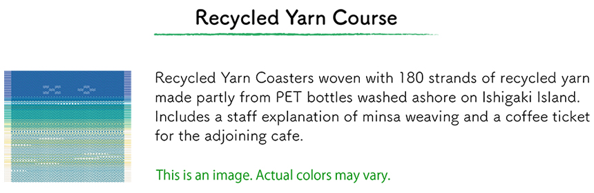 | Recycled Yarn Course | A coaster made using recycled yarn | Approx. 12.5×14.5 | 80 min | 3:00 PM | JPY 4,000 |