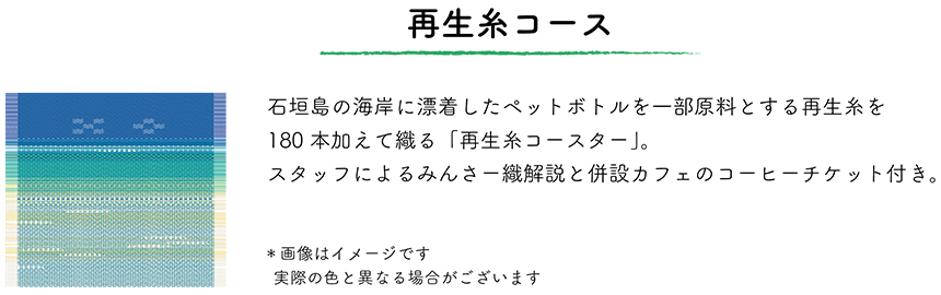 | 再生糸 | 再生糸を使用したコースター | 約12.5×14.5 | 80分 | 15:00 | 4,000円 |