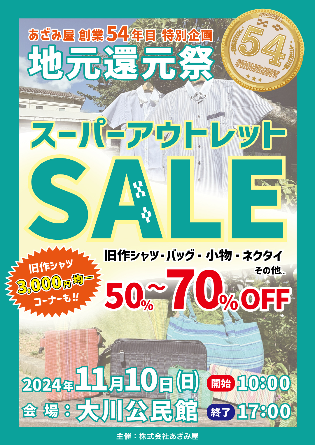 創業54年目を迎えるあざみ屋から、地元の皆様へこれまでの感謝の気持ちを込め、過去最大規模のアウトレットセールを開催いたします。