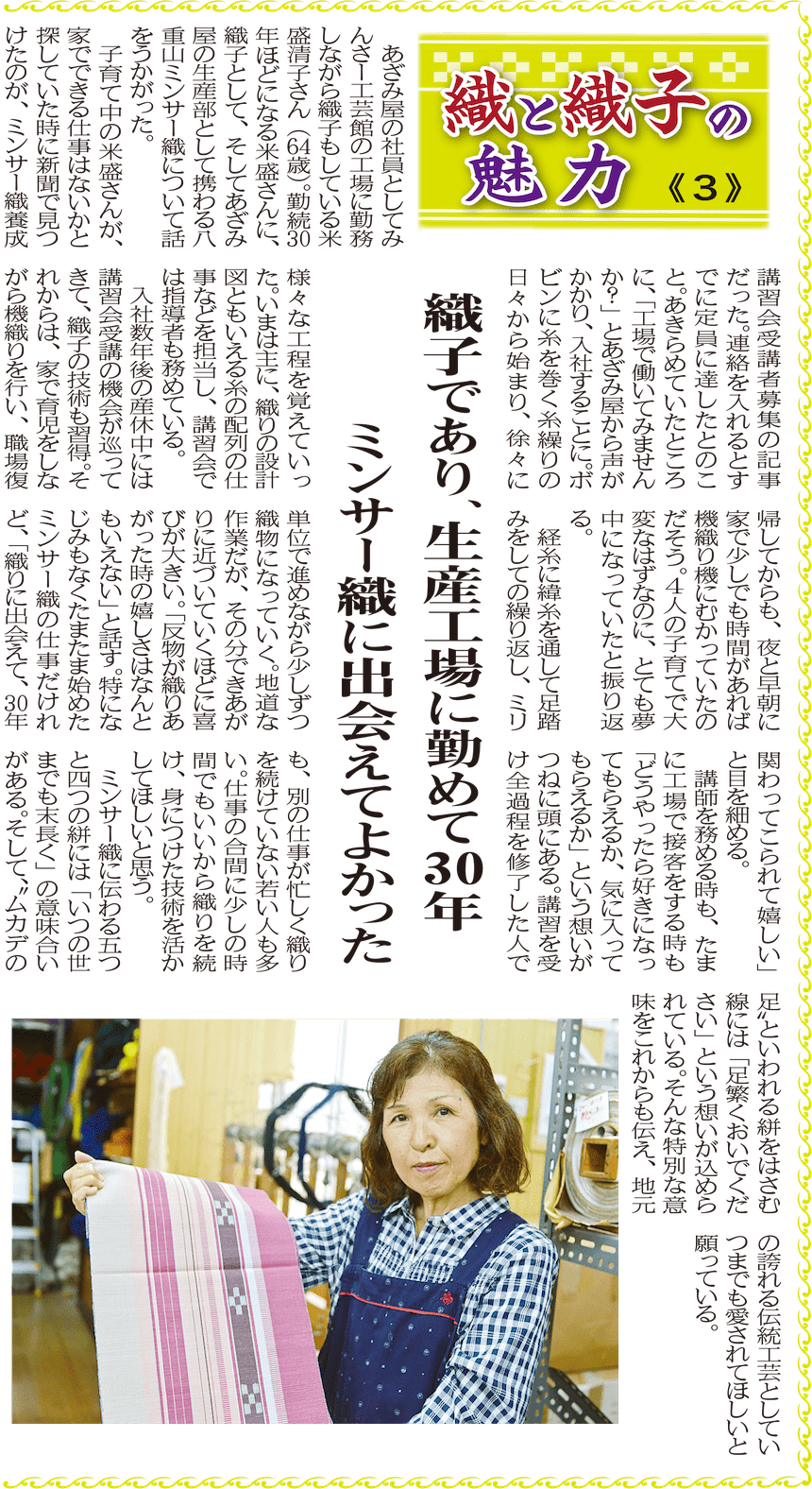 『織と織子の魅力③|織子であり、生産工場に努めて30年 ミンサー織に出会えてよかった』と題して、当社の社員で織子の「米盛清子さん」が紹介されています。
