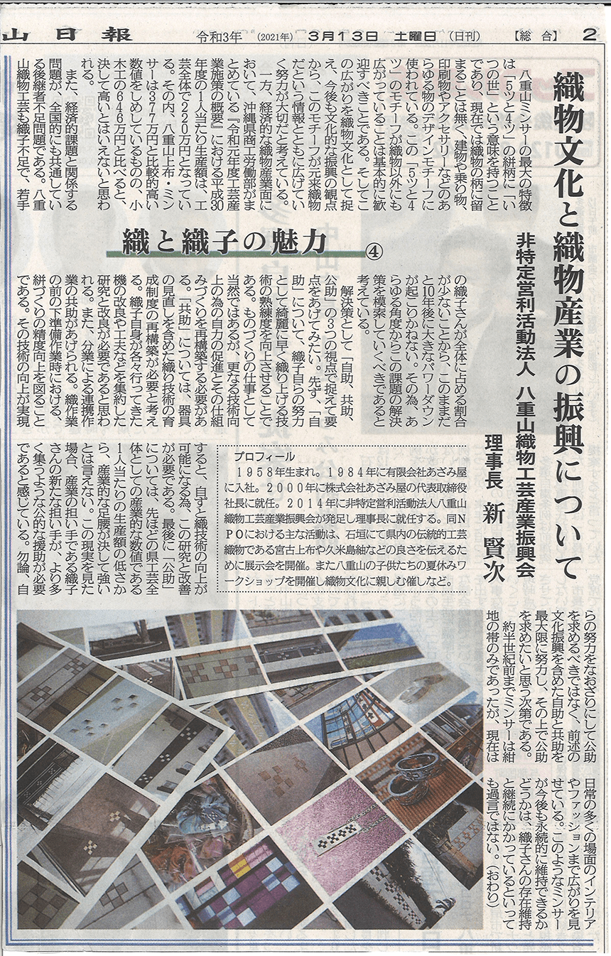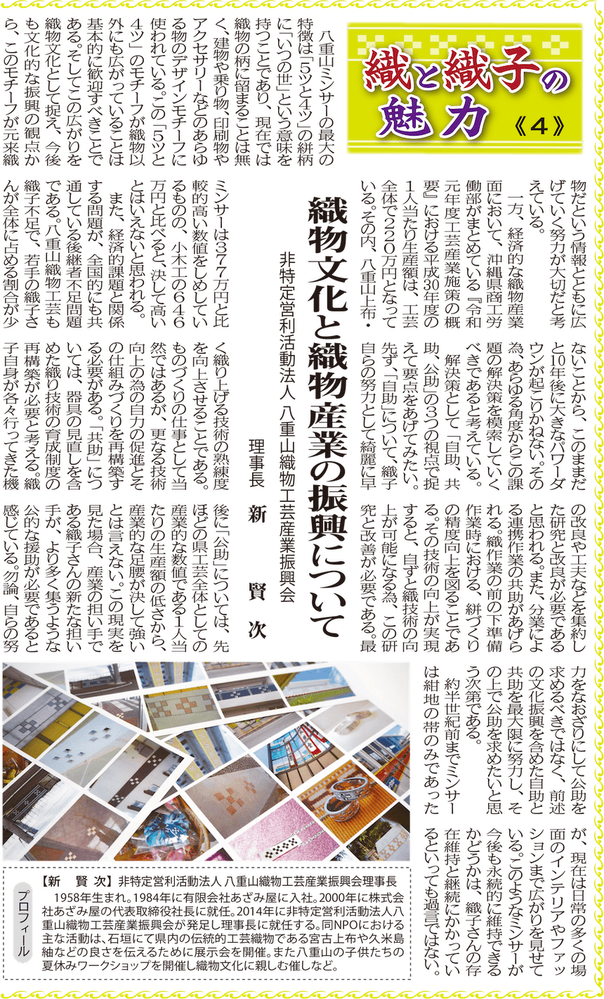 『織と織子の魅力④|織物文化と織物産業の振興について』と題して、当社の代表取締役 兼 非特定営利活動法人 八重山織物工芸産業振興会 理事長「新 賢次」をご紹介いただいきました。