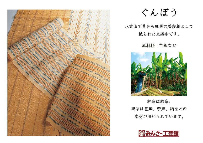 ぐんぼうは、琉球王朝への献上品である上布とは違い、古くから八重山の人々の毎日の生活で親しまれ、より実用的な着物生地として愛用されてきました。