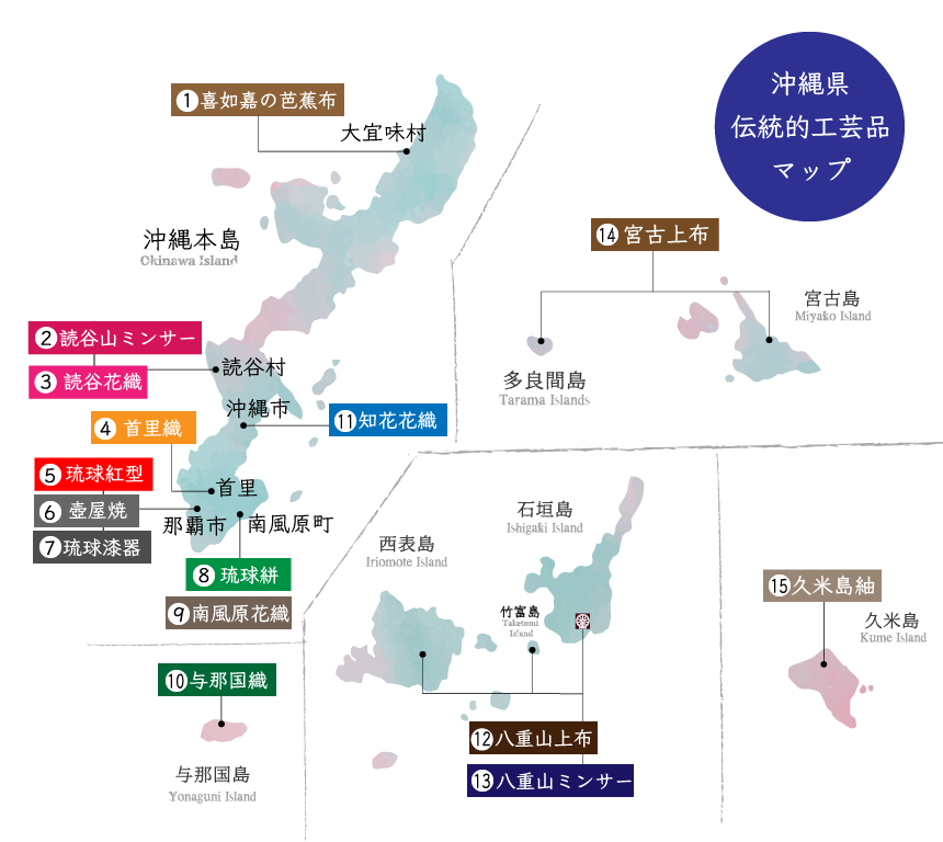 国の伝産法に基づき、経済産業省指定の「伝統的工芸品」は現在、全国230品目有りその内、沖縄県は15品目 あります。