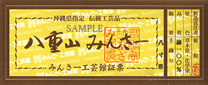 1989年4月11日付けで、伝産法(伝統的工芸品産業の振興 に関する法律)に基づき、経済産業大臣から伝統的工芸品の指定を受け、従来、石垣市や竹富町で織られていたみんさー織は、経済産業省告示第184号により「八重山ミンサー」と呼称 の統一がなされました。(※当社では、1971年創業当時より用いている「八重山みんさー織」表示を踏襲しております。)